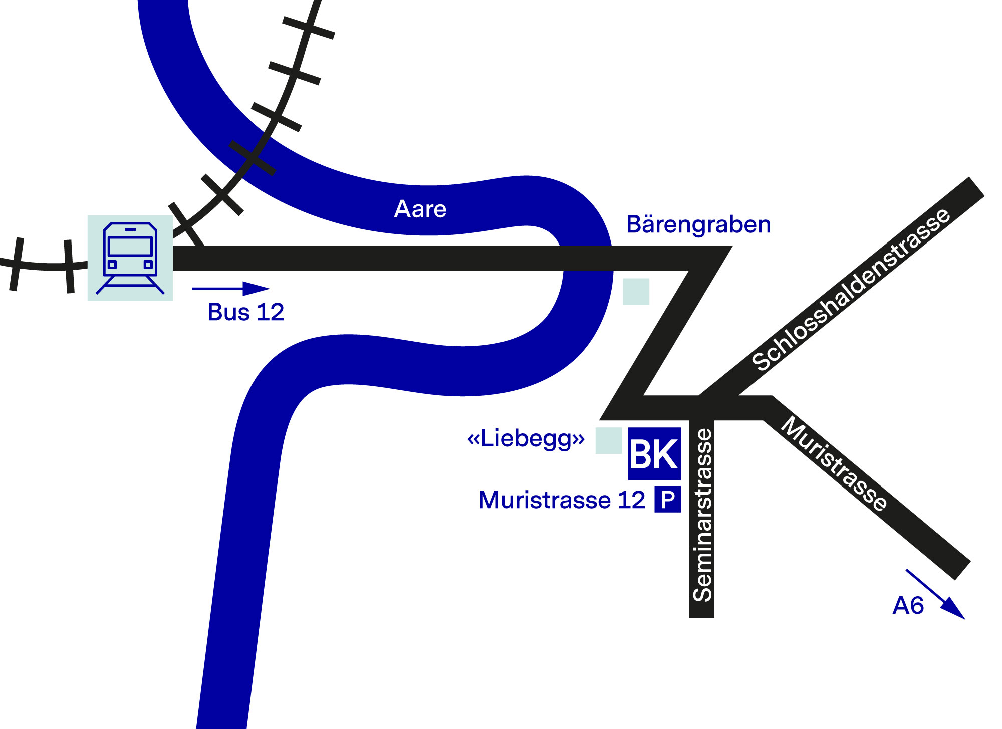 Mit dem AutoAutobahn A6 Ausfahrt A6 «Ostring». Beim Burgernziel-Kreisel rechts auf Muristrasse. Reservieren Sie einen Kanzlei-Parkplatz oder parkieren Sie in der Nähe (blaue Zone).